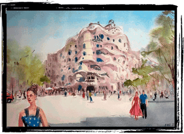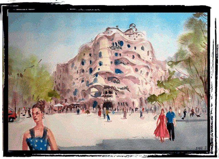 Barcelona is a city that never ceases to inspire. Its streets, squares, and buildings breathe movement, history, and emotion. In Lovers in La Pedrera, I wanted to transform that vitality into watercolor, combining the monumental presence of Gaudí’s Casa Milà with the intimacy of everyday life. The building’s undulating façade becomes the backdrop for a lively urban scene, while the couple walking together in the foreground embodies the essence of the work. For me, La Pedrera is not just architecture—it is a silent witness to the flow of life that unfolds around it.