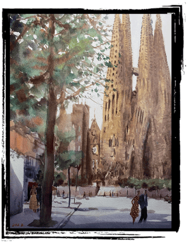 In Strolling under Sagrada Familia, Susana Esclusa offers a deeply evocative interpretation of one of Barcelona’s most emblematic spaces. Rather than presenting the Sagrada Família as a monumental icon isolated from its surroundings, she integrates it into the living pulse of the city. The basilica rises in the background like a cathedral of stone and light, but its presence is softened by the everyday rhythm of the street: the trees casting shadows, the passersby absorbed in their own trajectories, and the warm glow of a Mediterranean day unfolding naturally across the scene.